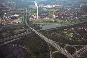 Im Vordergrund A42 und Autobahnkreuz Essen Nord.